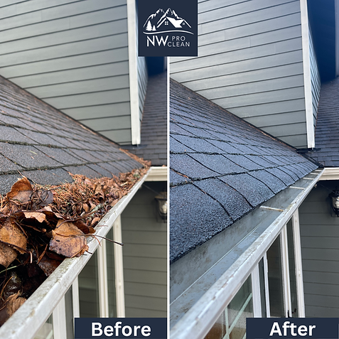 First NW Pro Clean will use backpack blowers to remove the loose debris that may be on the roof. All gutters are cleared out by hand the majority of time. NW Pro Clean uses ladders, cleaning tools, and buckets to remove the gutter debris without getting gutter muck all over the place. Then each downspout is checked to make sure the water is flowing properly. Generally the gutter debris is put in a yard waste bin, compost pile, or is dumped in the woods if approved by homeowner. Debris can be hauled away when there is no other option. In the summer time when everything is bone dry we like to blow out the gutters when possible. NW Pro Clean takes great care to not blow wet, nasty gutter debris onto your house, or under the eaves. NW Pro Clean always cleans up after the job is done.